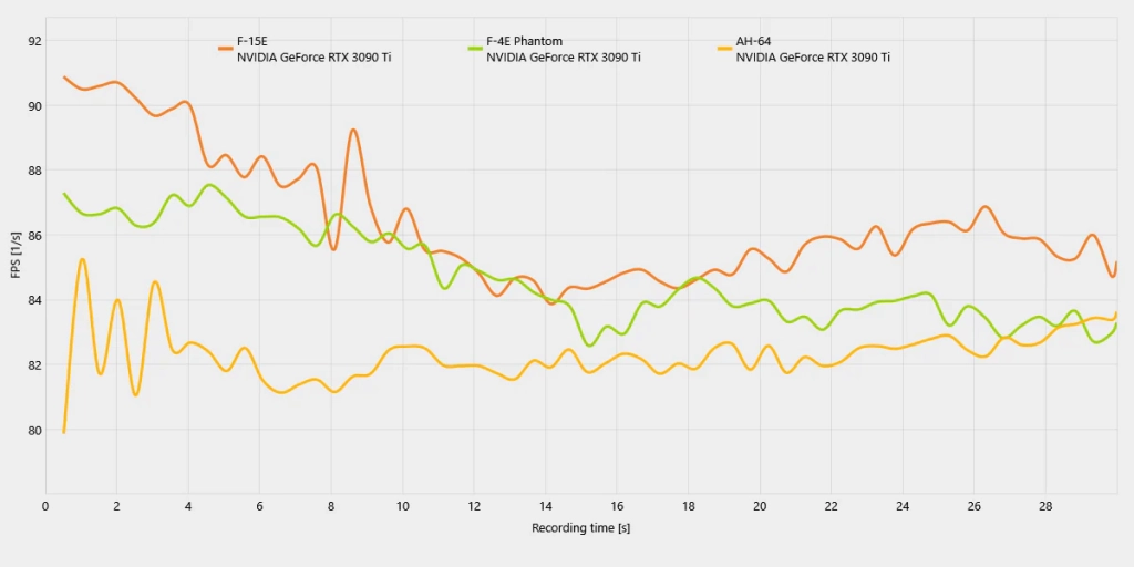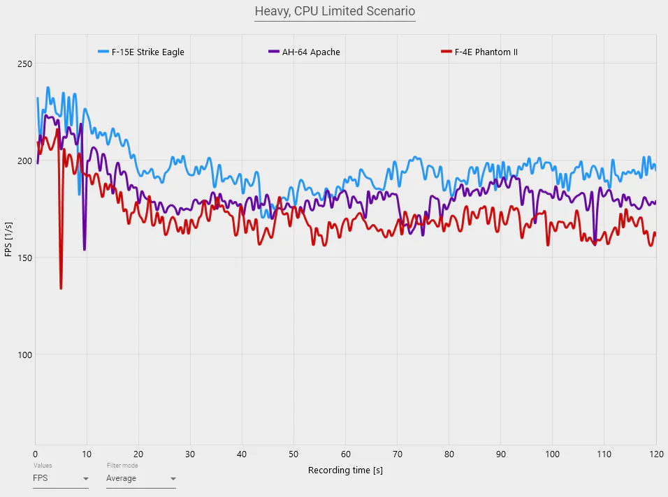 První graf, a pravděpodobně ten nejméně optimistický, ukazuje scénář s omezeným CPU (spíše než s omezeným GPU), který ukazuje, že F-4E má o něco horší snímkovou frekvenci než AH-64D Apache, který je jedním z nejtěžších modulů v simulaci. Ve většině z nich je rozptyl mezi nimi poměrně nízký...., ale i tak bude trochu obtížné spustit jej na systémech s omezenějším CPU.