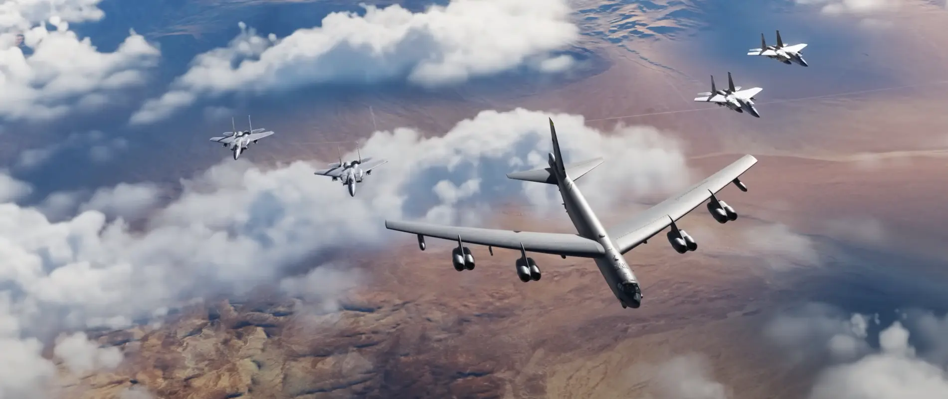 Pak se nám naskytne krásný záběr nového letounu B-52 s umělou inteligencí, který letí společně s letouny F-15. Na tomto záběru je to hůře rozeznatelné, ale v navazující sekvenci vidíme, že přinejmenším některé z nich jsou F-15E, které jsou v současné době ve vývoji od RAZBAMu.
