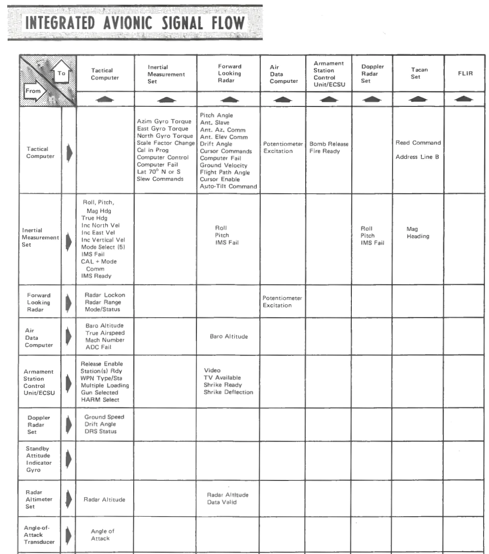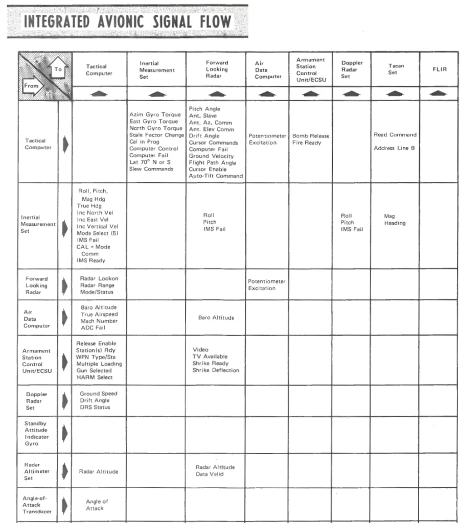 Naštěstí se příručka NATOPS věnuje tomuto toku informací velmi podrobně vývojový tým získal přístup k dokumentu, který podrobně popisuje vnitřní fungování softwaru používaného v avionické sadě. Níže si můžete prohlédnout příklad, jen jednu stránku z mnoha, která ukazuje tok informací v letadle.