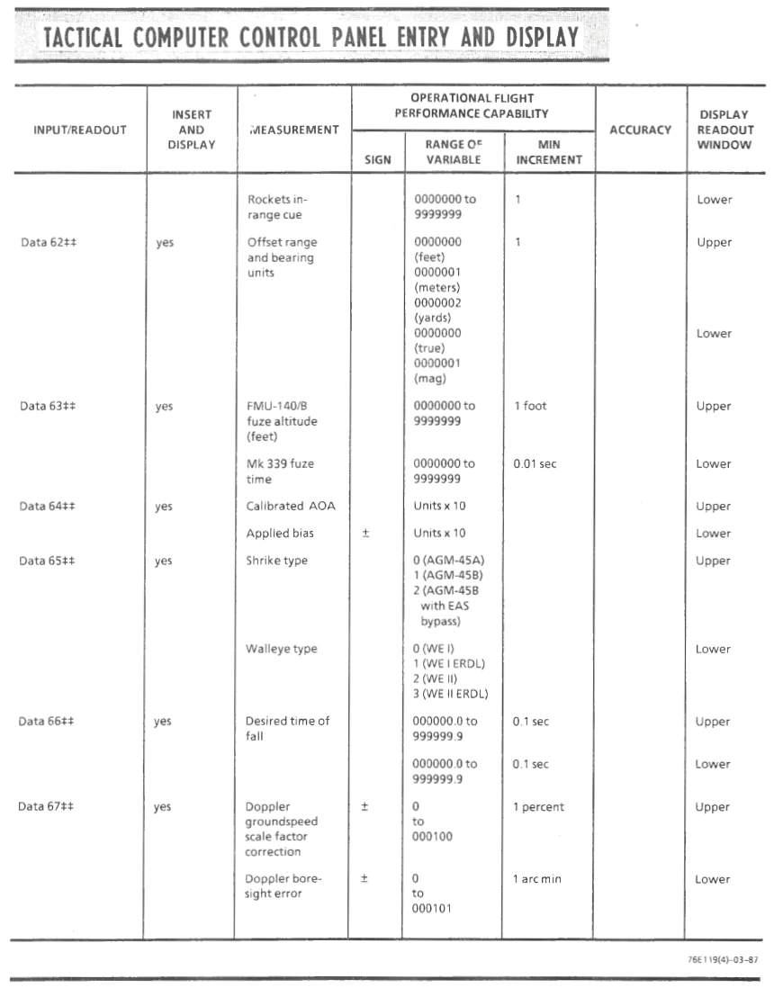 Nyní se také začalo vážně pracovat na taktickém počítači, jedné z nejsložitějších částí letounu (a tudíž i nejsložitější na vývoj). Corsair nemá žádné moderní MFD; proto veškeré vstupy, které pilot potřebuje provést, nastavení, která je třeba změnit, údaje, které je třeba přečíst - to vše se děje prostřednictvím taktického počítače a jeho číselných vstupů. Funkčnost taktického počítače je obrovská a přesahuje rámec této zprávy; níže jsou však uvedeny některé vstupní kódy, aby nám přiblížili, jak se počítač ovládá a jak rozsáhlé množství informací lze podle potřeby upravovat.