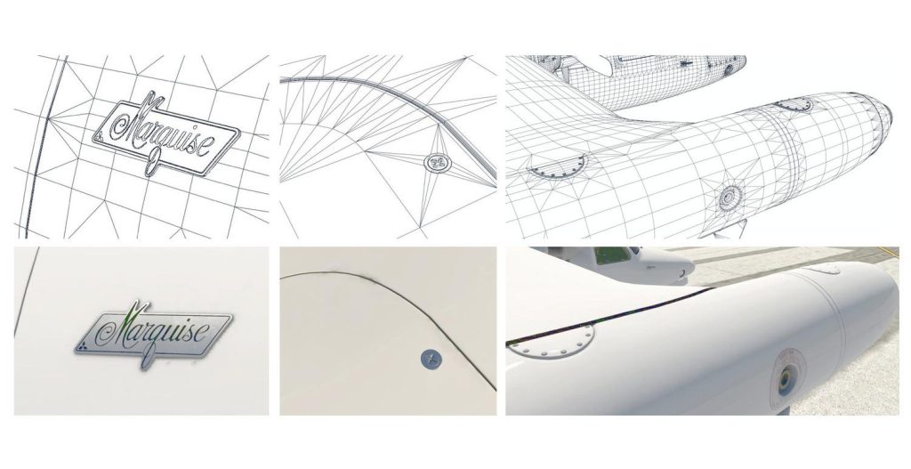 Pokud si prostudujete oba výše uvedené obrázky, zjistíte, že verze 2.0 má 3D model s vyšší hustotou po celém obvodu; všimněte si však tmavších oblastí 3D drátěné sítě. Jedná se o oblasti, kde byly použity vyšší 3D detaily, aby bylo dosaženo ostřejších vizuálních výsledků, které realističtěji odrážejí světlo při pohybu kamery. Tradiční způsob, jakým se takové detaily přidávají, je použití "obtisků" textur s vyšším rozlišením, podobně jako obtisky na plastových modelech. Ačkoli jsou obtisky skvělou technikou a jsou naprosto užitečné, chybí jim přesnost jemné interakce světla kolem geometrických hran při bližších úhlech kamery. Světelné detaily na 3D hranách byly vždy jednou z těch oblastí, které tvoří rozdíl mezi falešně vypadajícím 3D modelem a modelem, který ožívá. Následující obrázek ukazuje několik oblastí, kde 3D detail ovlivňuje osvětlení. Ačkoli jsou vyšší detaily použity tam, kde je to důležité, nebyly přidány tam, kde to není potřeba, což dává efektivní 3D model, který je v X-Plane velmi výkonný.