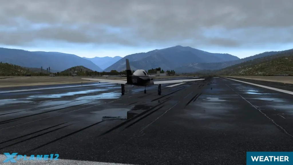 Nové jsou v X-Plane 12 také efekty počasí na zemi. Součástí tohoto nového systému budou také objemové kaluže a sníh.