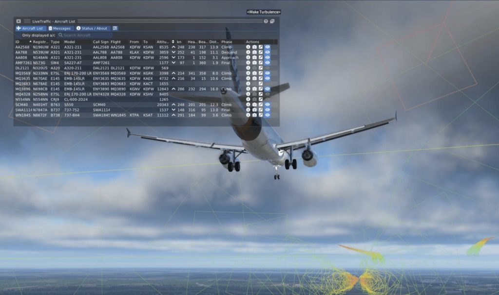 Letadla s umělou inteligencí v X-Plane používají plný letový model. To znamená, že každé křídlo je počítáno stejnými metodami a se stejnou přesností jako u uživatelských letadel. Množství energie zanechané ve vírech proudění je tedy jednoznačně známo, vychází pouze z letového modelu. Pokud tedy ATC povolí vzlet oné 747 před vámi, nezapomeňte zůstat nad její letovou trajektorií, dokud se od ní nebudete moci odklonit. Při přistání se držte nad dráhou předcházejícího letadla a přistávejte o něco dále na dráze než oni, abyste zůstali v bezpečí.