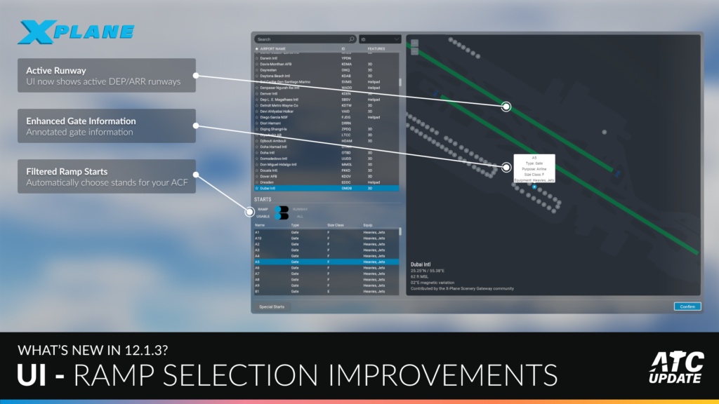 Během konfigurace letu vám nyní X-Plane poskytuje další informace o různých bránách a rampách, které jsou na vybraném letišti k dispozici. LR přidali také novou možnost zobrazit pouze parkoviště a vzletové a přistávací dráhy vhodné pro vaše letadlo.