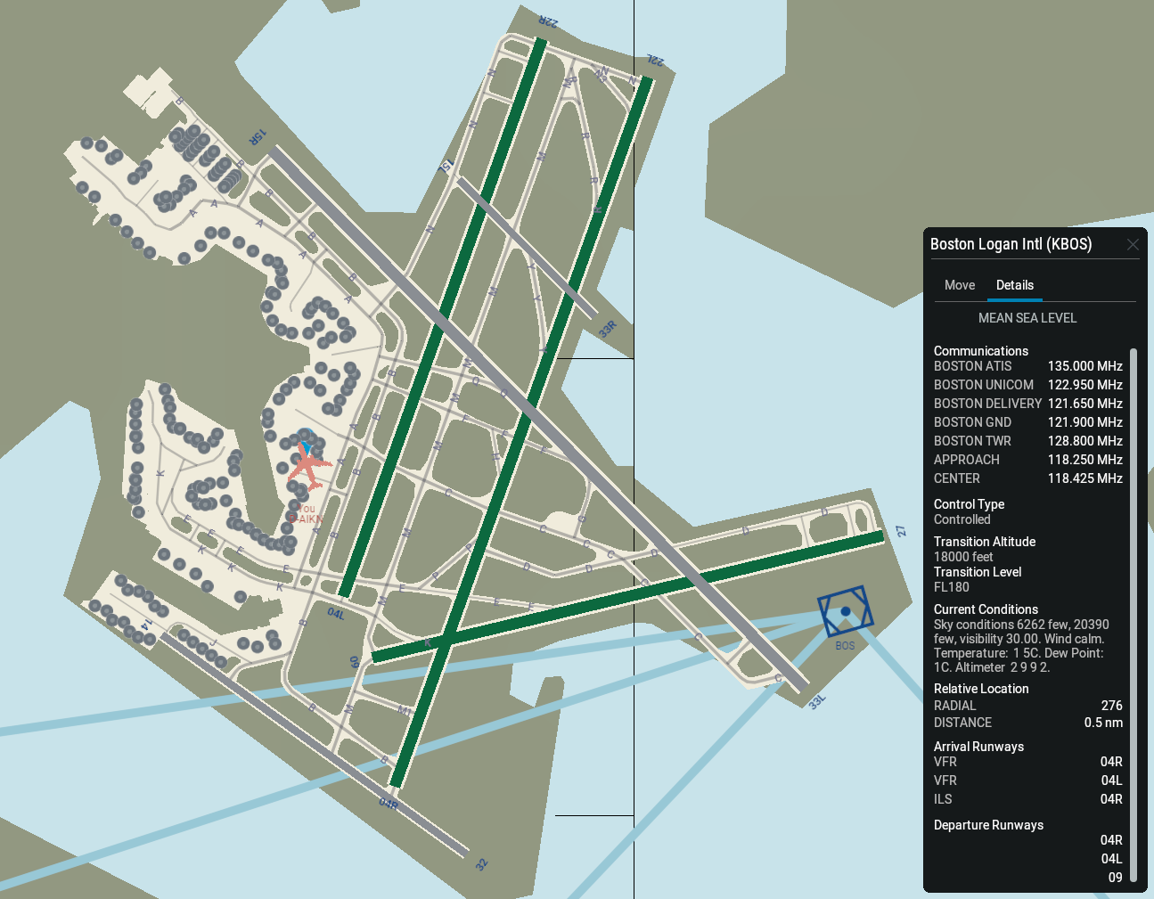 Při přiblížení letiště se zvýrazní aktivní vzletové a přistávací dráhy podle aktuálního počasí.